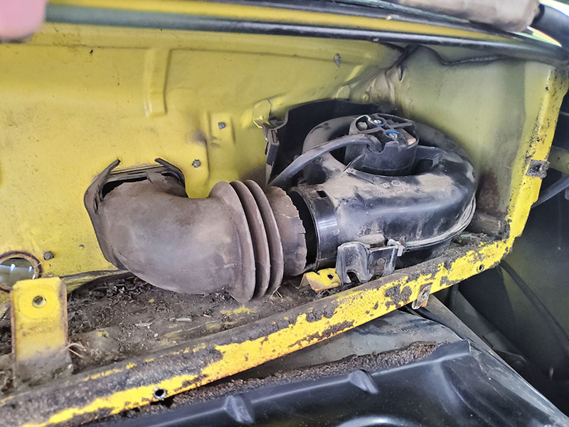 Fresh Air Fan / Blower motors are found in Standard Beetles, Super Beetles, Type 3's, and Busses. The blower pictured here is out of a Super Beetle. Blower motors are used/junkyard only items, although there are a few vendors online who sell reconditioned blower motors for $200-$300. Just as rare is the fresh air duct hose which is often deteriorating due to age. VW enthusiast usually fashion new ducts out of flexible plastic tubing.
