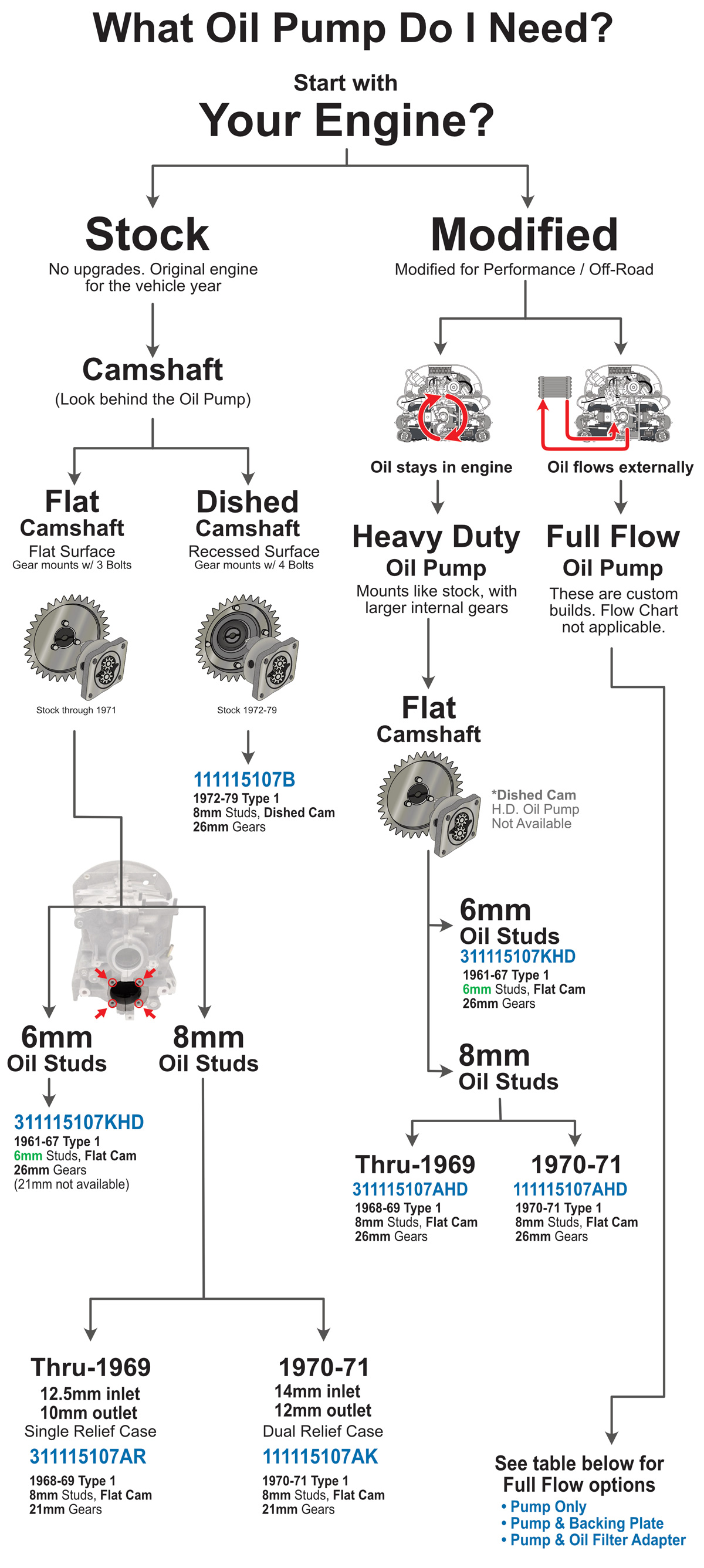 Not only that but it's common for engine builders to swap camshafts and engine cases over the lifespan of your vehicle, further adding to the confusion of which oil pump is correct for your vehicle. We hope to cover the basic differences of air cooled oil pumps in this brief article, and give you some pointers so you can order the right oil pump for your vehicle. By the end of this article you’ll be able to confidently identify the correct oil pump for your VW air-cooled engine and avoid common mistakes.