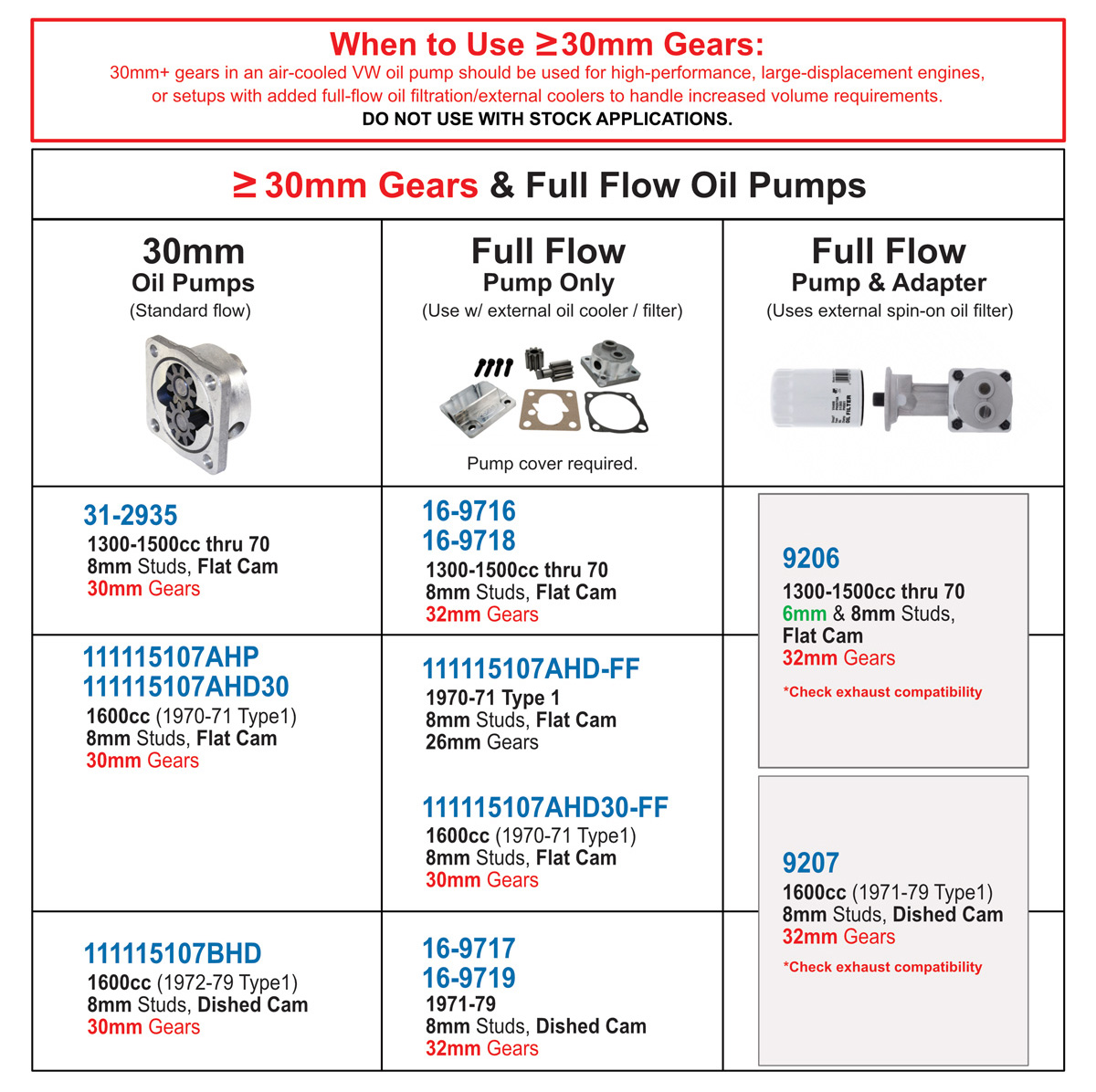 Full Flow Oil Pumps allow you to use external oil coolers, oil filters, or both. Note that installing a full flow oil systems bypasses the engine case's oil return passage and will require tapping your engine case for a new oil return line.
