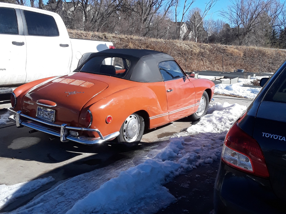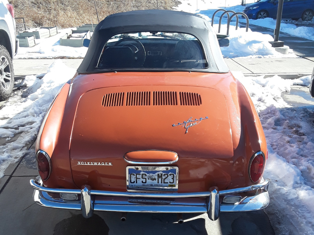 It's the 3rd Karmann Ghia I've owned ('58 Bamboo Coupe), but I've also owned an immaculate 1973 British Racing Green convertible with saddle interior and top, which I sold years ago for top dollar …$2500.( I don't think about this too often.)  Nice features are a factory plate glass rear top window, and front disc brakes, of all things. Still looking for an original Blaupunkt 12v radio, as the seller had installed a high tech player with subs, most of which I've pulled out.