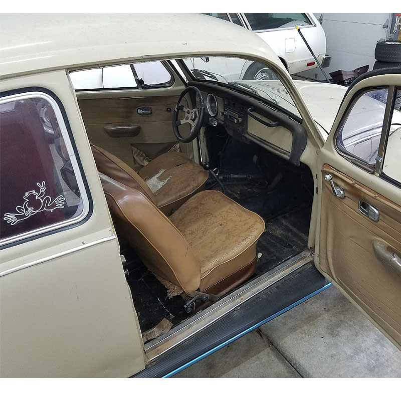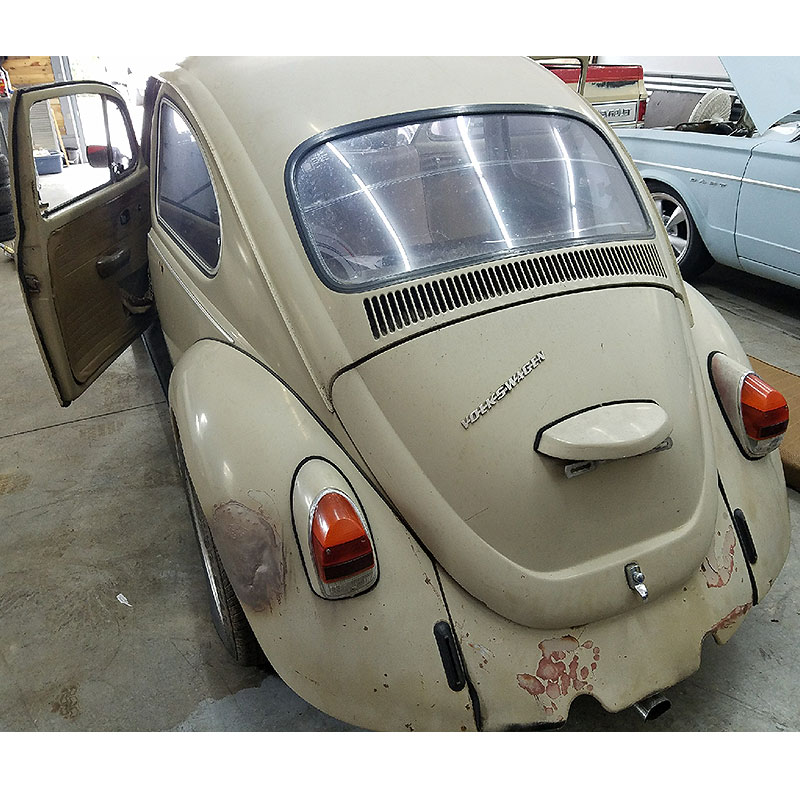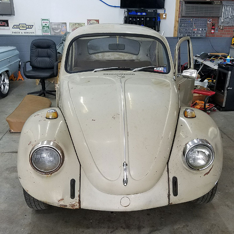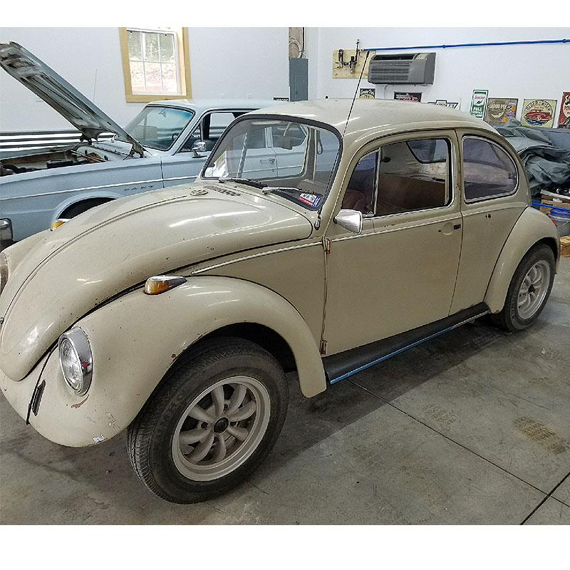 Well it all started about a year ago, when I found this Bug on the South Carolina craigslist. The guy wanted $2000 for it, so my wife and I decided to take the trip in a 2002 Toyota 4 Runner with 270,000 miles on it, and a homemade VW towbar in hand. We bought it, and towed it home. The car was barely driveable as is, so I decided on a full body off restoration. I was told of the JBugs company by a friend, and started to study and make list of every part I was planning to address. I pulled the engine first,and decided to completely tear it down. Being a 1500 cc single port, I was going to rebuild with 87 mm pistons, and make it a dual port with new heads and manifold. I purchased the EMPI GTV-2 single valve spring heads from J bugs. This would turn it into a 1641 cc engine. All other engine parts were purchased new, the only part left of the original was the case. The body was major work, including new floors, heater channels, firewall, one front, one rear fender, rear apron, and a lot of welding! I would paint the car as well, so many hours of body work went into the final outcome as well. The front end was completely disassembled, and replaced with all new parts. 4 wheel disc brakes were installed. Rear and front heavy duty sway bars were installed with urethane bushings. I purchased the EMPI polished aluminum 5 spoke rims, and fitted them with Contenental 165/60's on all four wheels. I did not replace the transaxle, or do anything to it, as when I removed it, it was working fine. A complete cleaning, and replacement of easy to get to gaskets was all that was done. A new Sachs clutch, and all related parts was installed. A full undercoating was sprayed, as well as all chassis parts before reassembly was started.
