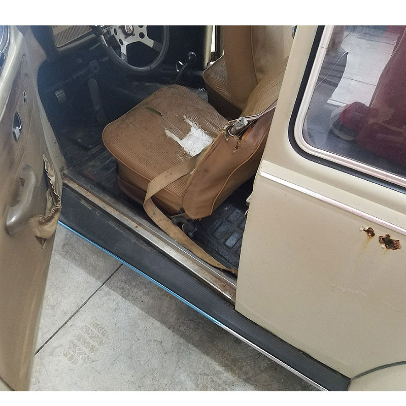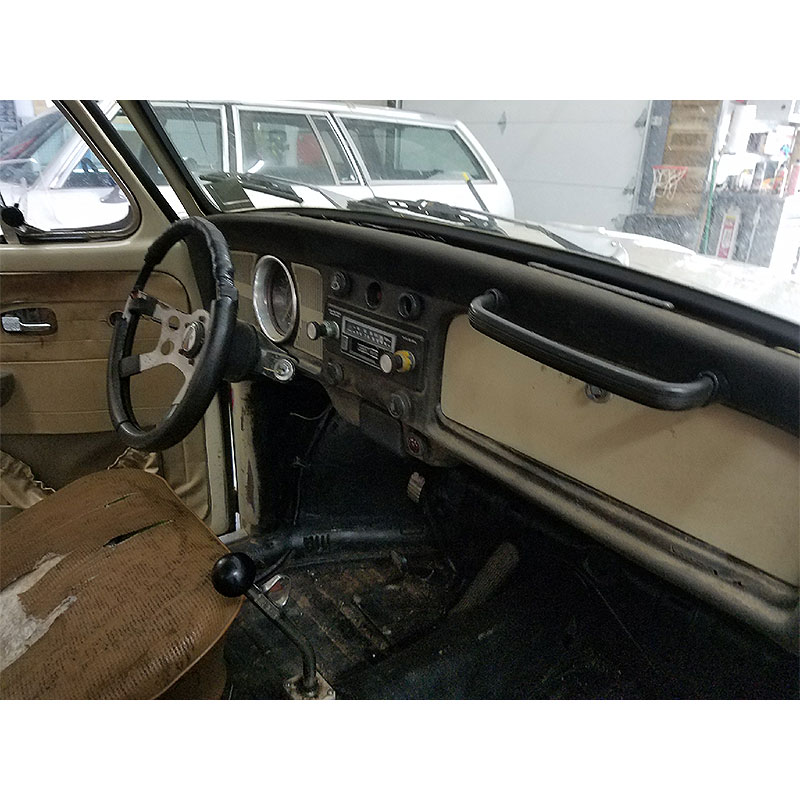 The interior was made by Sewfine, the carpet was purchased from Jbugs, the floormats are from Coco mats. I installed gauges on the sides of the speedo, and have found that these are of great help while driving. They include a cylinder head gauge, oil pressure, volt, tach, and a clock. A retro stereo was installed with 4 speakers, a subwoofer, and seperate amp. An auxiliary electric heater was installed under the dash to help with the frigid New England winters!! I re- did the entire electrical fuse panel and system under the hood, as the original one was too messy for me, and I wanted more organization all of the extra components. It has proven to work beautifully.