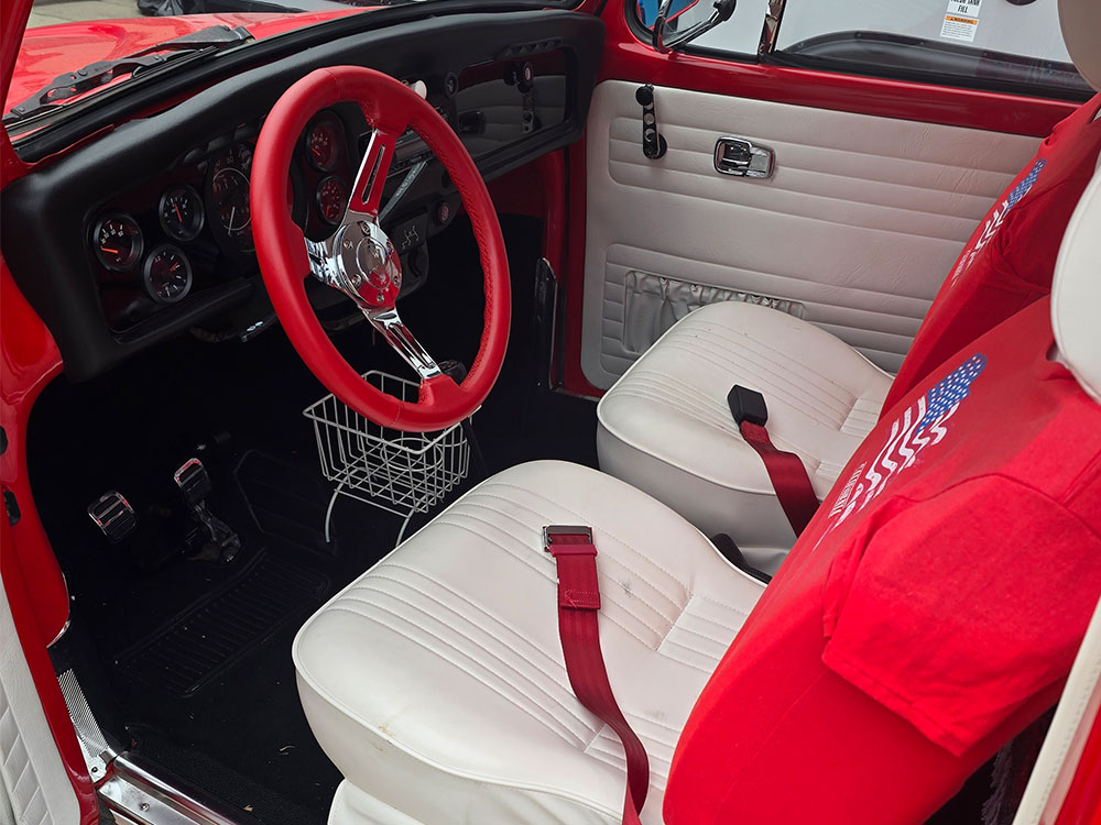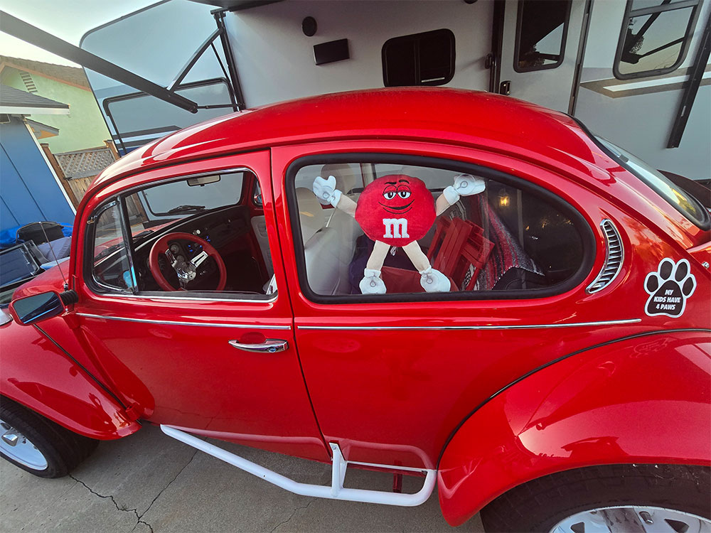 This is my 1973 Beetle Baja known as "Big Red". It's been 2 years in the making. I had to take it all the way down to just a shell. The improvements I made during the course of the build include converting to disc brake all the way around, custom paint and trim, front and rear bumper cages, and a new wiring loom. I upgraded to a 1904cc, 90 horse power engine Gervais engine, from the stock 1600. I also installed a new carpet kit, door and side panels, dash pad and headliner, custom red steering wheel, custom electrical system, off road wheels and tires, off road KC spots and fog lamps, new axles, all new stainless steel trim and, added my red M&M mascot.