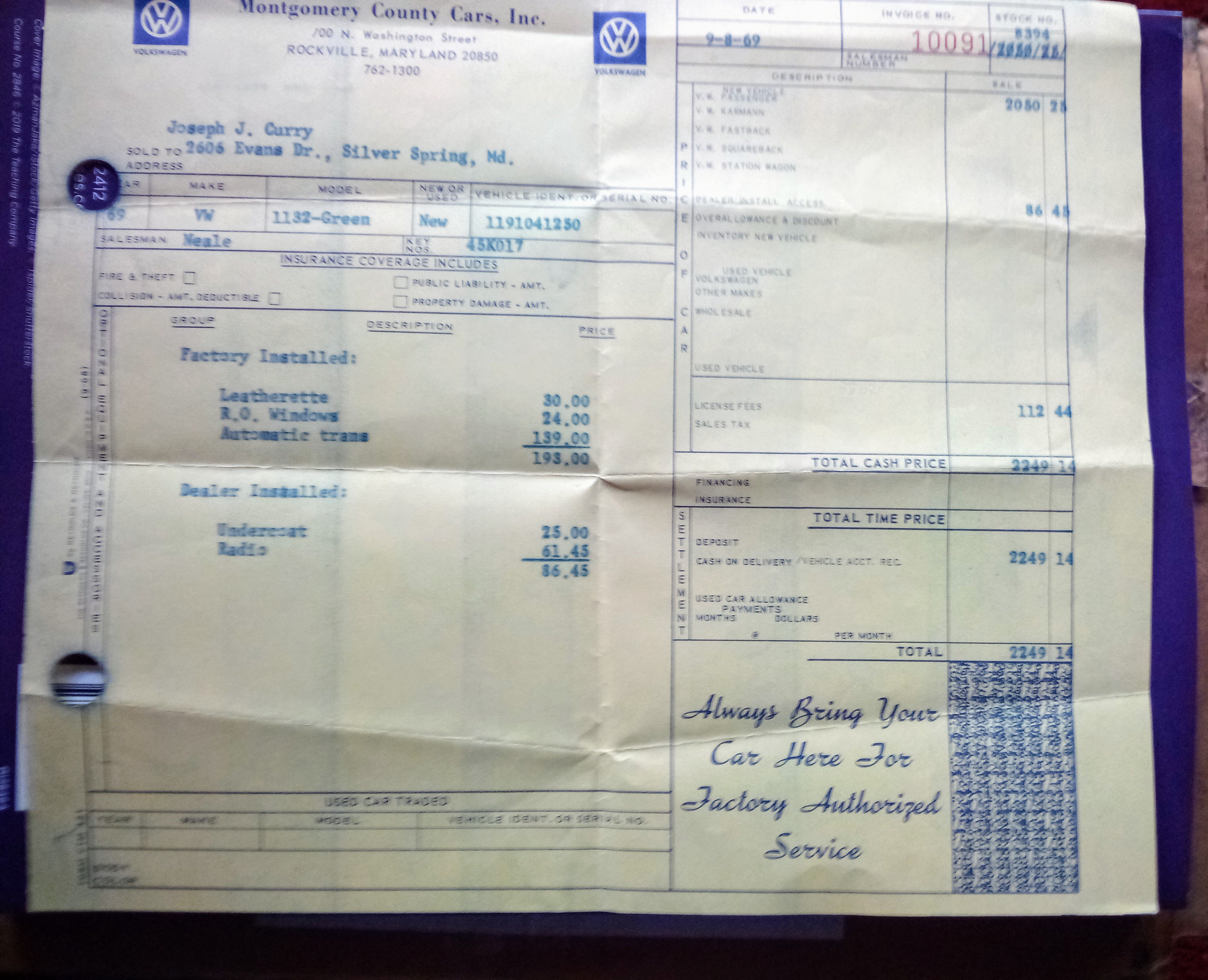 My father purchased a brand new semi-automatic stick shift Beetle sedan for my use on September 8, 1969, from Montgomery County Cars, Inc. for $2,249.14. It has been a great joy to drive "Betsy" in the DC, MD, and VA areas all these years. It is my lucky car - having no serious accidents despite several close calls.