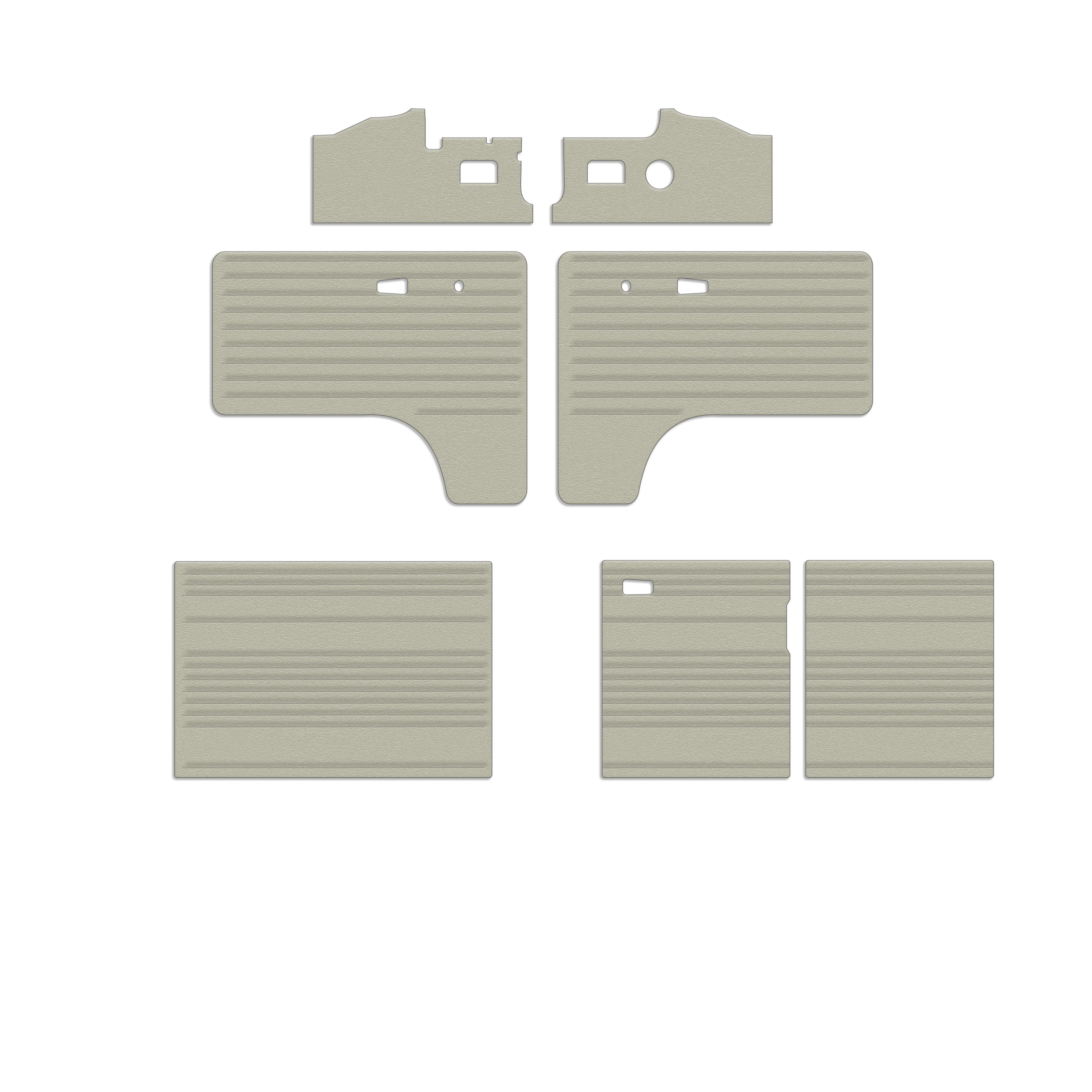 These Crew Cab 1968-1970 Vinyl door panels come as a full set of panels, 7 pieces total. The 7 pieces included are front, kick panels, side door, and rear quarter panels. These high quality door panels produced by TMI feature heat-seam patterns and thick Masonite board pre-cut for door panel clips to provide durability while making installation painless. They are available in the following colors: black, brown, tan, beige, off-white, grey, red, saddle, blue, bright white, charcoal, cream white, dark green, chalk white, and bright red. Our door panel material is the same as the seat upholstery so you can be assured of a matching interior. Door panel clips and seals are NOT included but can be added in the drop down menu above.