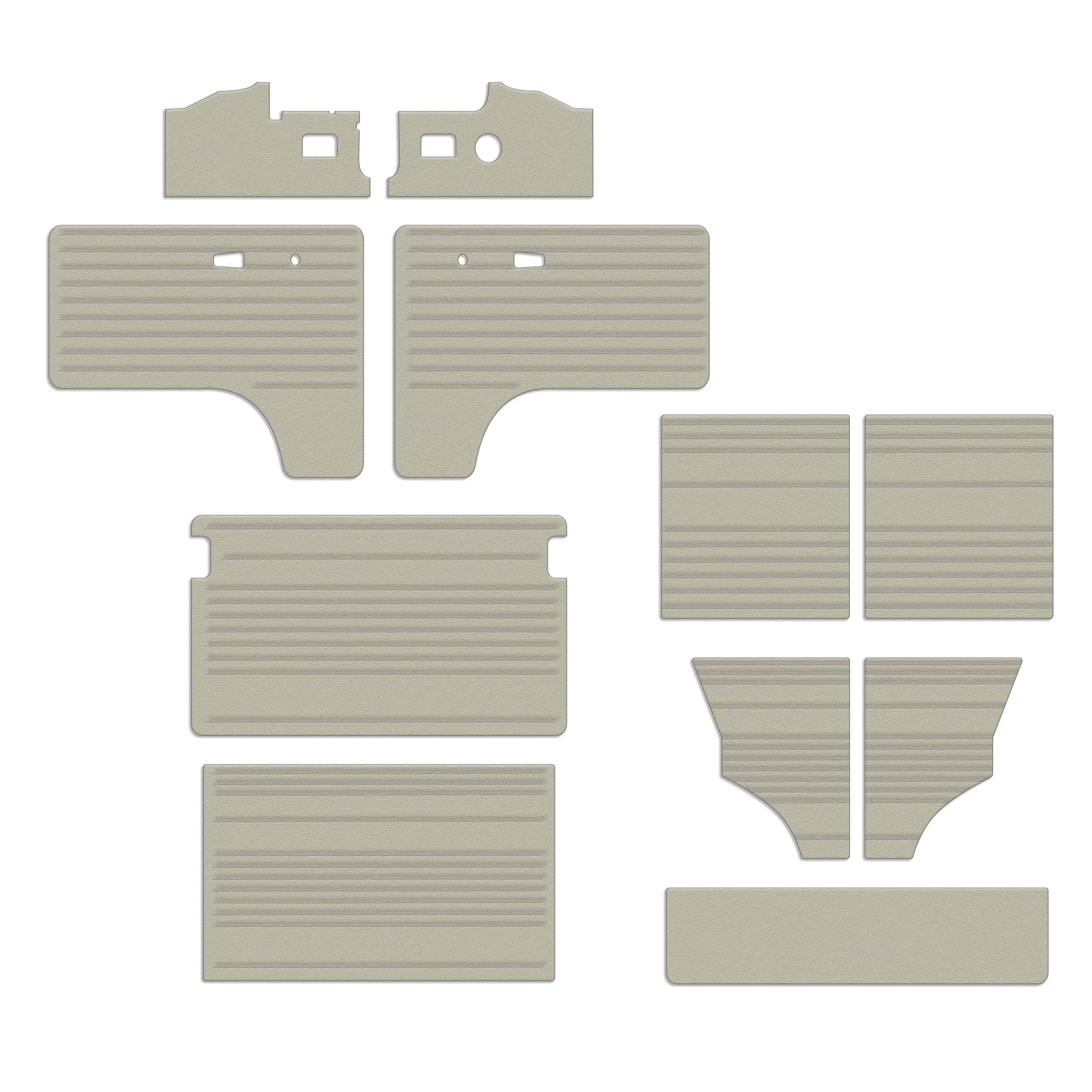 These Bus/Transporter 1968-1970 Vinyl door panels come as a full set of panels, 11 pieces total. The 11 pieces included are front, kick panels, sliding door, rear hatch, behind front seat, panel across sliding door, and rear quarter panels. These high quality door panels produced by TMI feature heat-seam patterns and thick Masonite board pre-cut for door panel clips to provide durability while making installation painless. They are available in the following colors: black, brown, tan, beige, off-white, grey, red, saddle, blue, bright white, charcoal, cream white, dark green, chalk white, and bright red. Our door panel material is the same as the seat upholstery so you can be assured of a matching interior. Door panel clips and seals are NOT included but can be added in the drop down menu above.