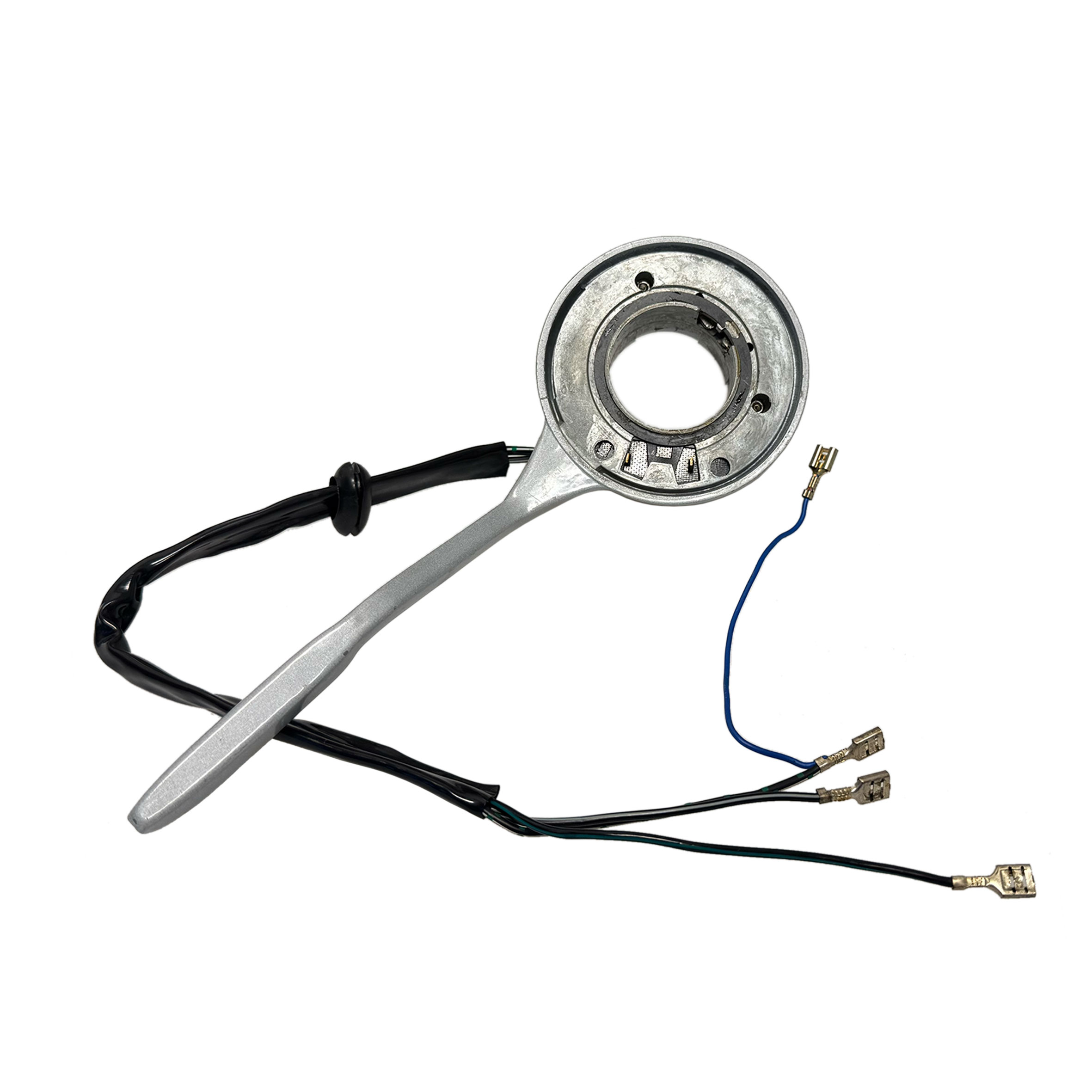 The silver aftermarket VW turn signal switch is a replacement for the original three-wire unit, designed for 1962-1965 Beetles and 1961-1965 Karmann Ghias. It features three extra wires in the loom that are not commonly used. This switch offers a more affordable alternative to the original units, which have been discontinued.