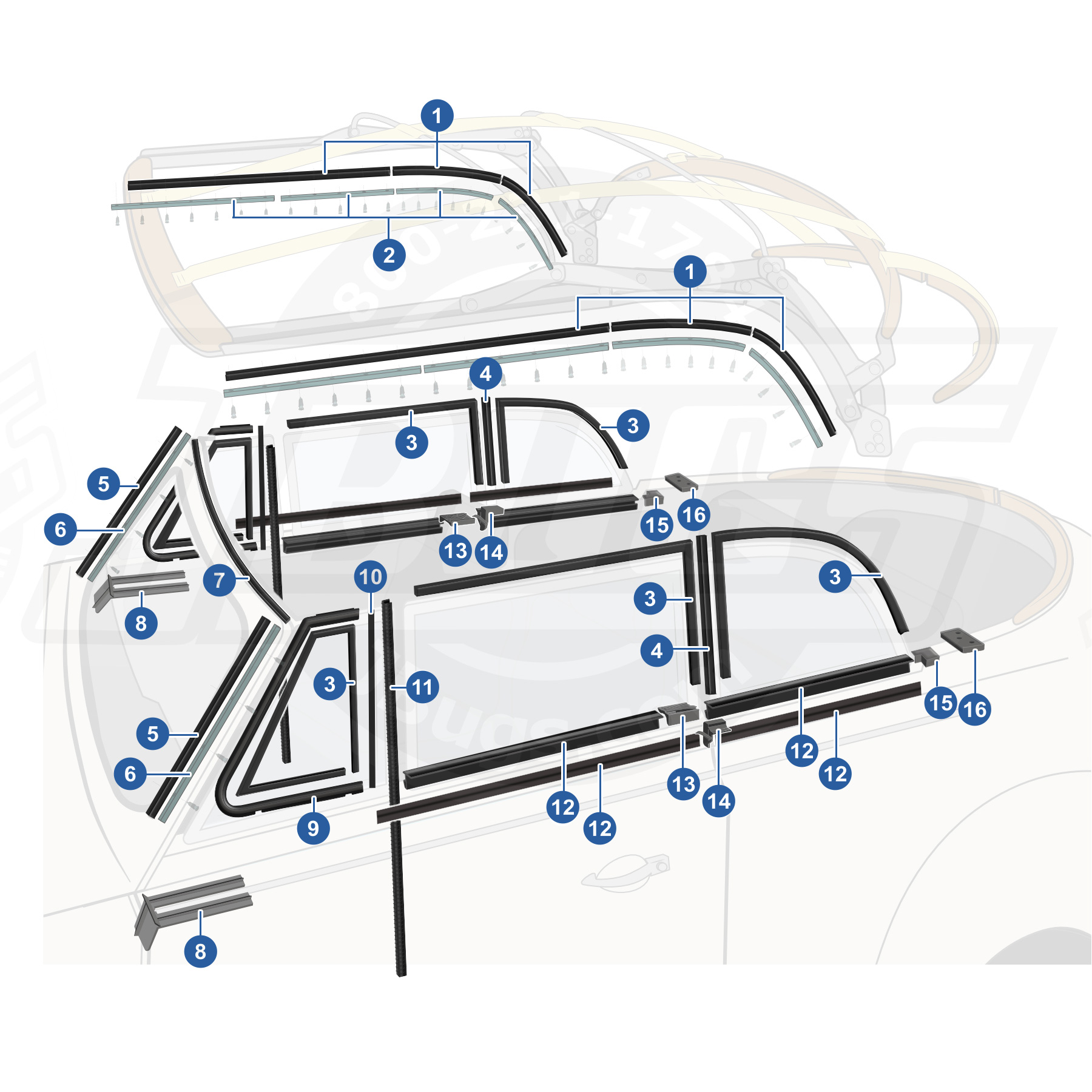 Our high quality VW Metal Inserts for Side to Top Seals fit 1950-1964 Beetle Convertibles. These are the Metal Inserts For Side To Top Seals. Used to fasten Top-to-Frame Seal on Convertible folding frame. 8 Piece insert set.