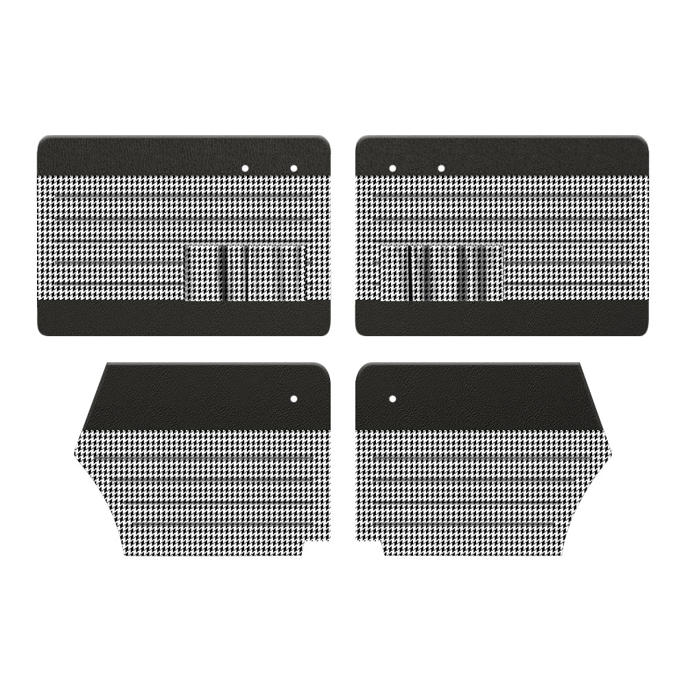 These 1950-1955 VW Beetle Convertible two tone horizontal houndstooth door panels come with front pockets and as a full set of front and rear panels, 4 pieces total. You can choose the combination of smooth vinyl and houndstooth fabric you want for the base and the insert. These door panels are the perfect complement for 2-tone or 12 inch insert seat upholstery. These panels are made by TMI with high quality components and attention to detail. Our door panel material is the same as the seat upholstery so you can be assured of a matching interior. Door panel clips and seals (P/N DP-InstallKit) must be purchased separately. Please Note: houndstooth cloth products are not heat seamed.
