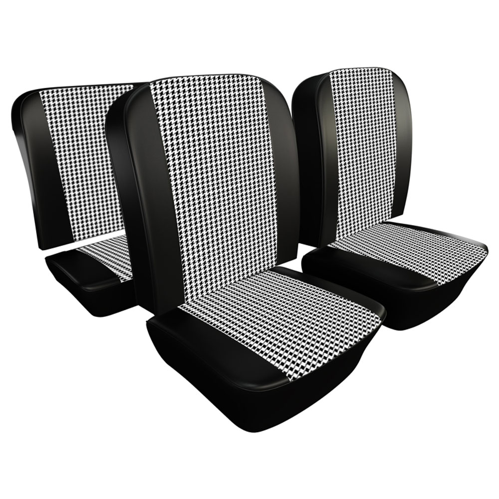 Our 1954-1955 VW Beetle Sedan full set seat upholstery kit includes front and rear seat upholstery in 2-tone houndstooth with 12 Inch Insert. The 12 Inch Insert is a 12 inch wide vertical stripe on the seat and backrest surfaces. Choose a houndstooth fabric pattern for the 12 Inch Insert and a smooth vinyl color for the outer areas. Includes vinyl piping and original sewn pattern. Please Note: houndstooth cloth products are not heat seamed. Original patterns are sewn in.