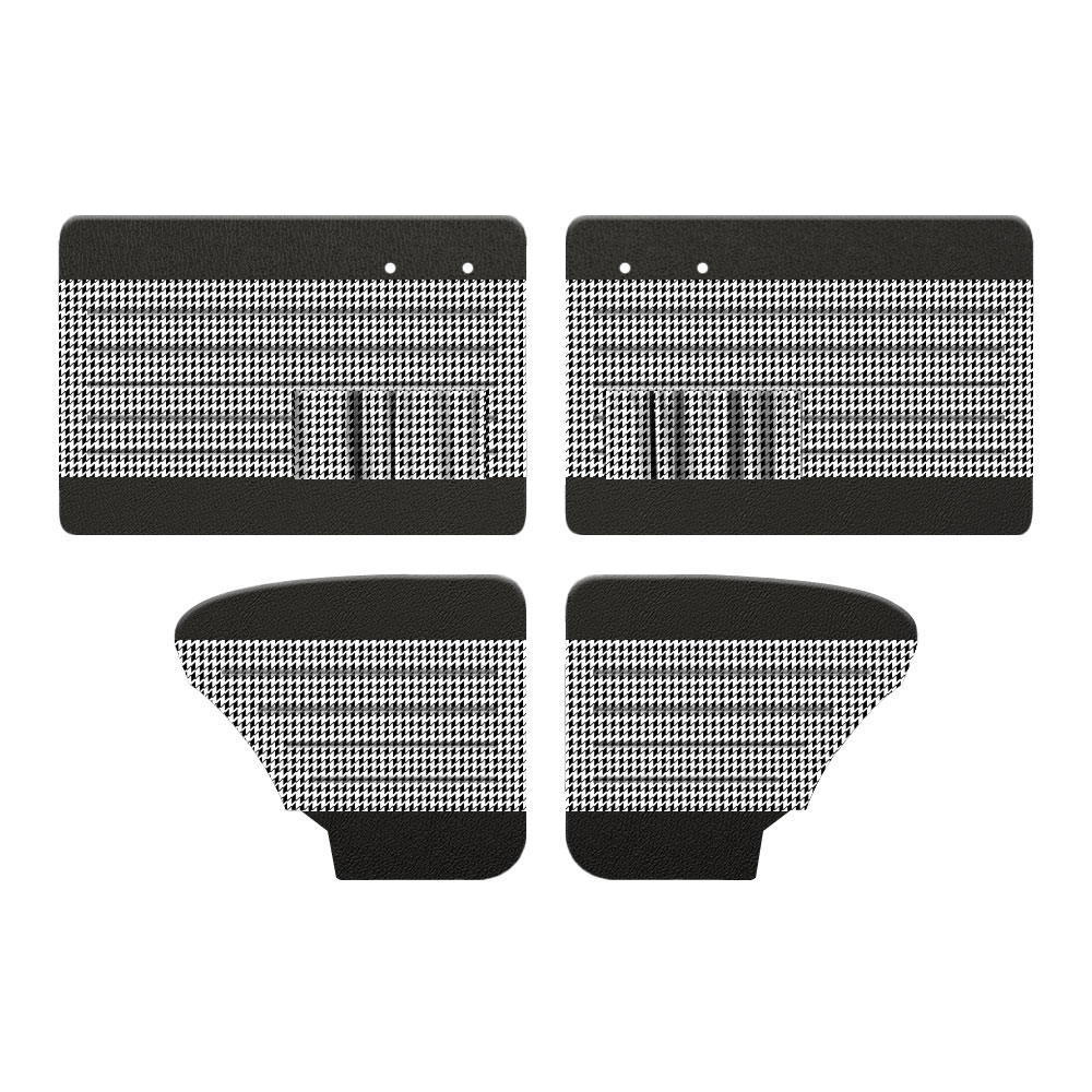 These 1965-1966 VW Beetle Sedan two tone horizontal houndstooth door panels come with front pockets and as a full set of front and rear panels, 4 pieces total. You can choose the combination of smooth vinyl and houndstooth fabric you want for the base and the insert. These door panels are the perfect complement for 2-tone or 12 inch insert seat upholstery. These panels are made by TMI with high quality components and attention to detail. Our door panel material is the same as the seat upholstery so you can be assured of a matching interior. Door panel clips and seals (P/N DP-InstallKit) must be purchased separately. Please Note: houndstooth cloth products are not heat seamed.