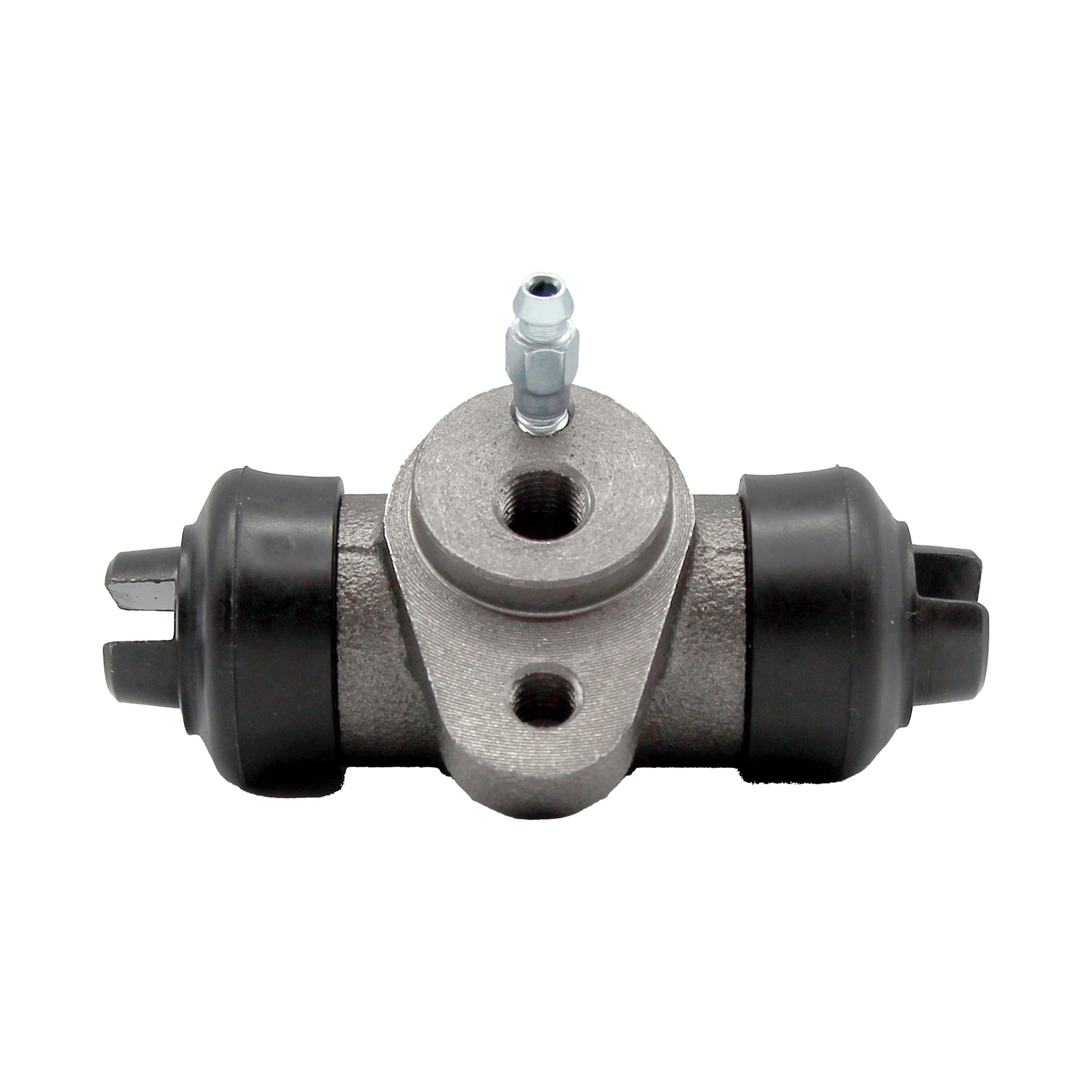 This front wheel cylinder mounts to the backing plate inside the brake drum and connects to the hydraulic system. When hydraulic pressure is applied, internal pistons move the brake shoes outward against the drum surface to slow or stop the vehicle. Each cylinder is sold individually and will fit either side.