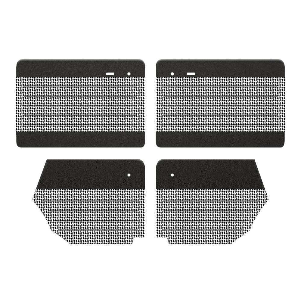 These 1967-1972 VW Beetle and Super Beetle Convertible two tone horizontal houndstooth door panels come without front pockets and as a full set of front and rear panels, 4 pieces total. You can choose the combination of smooth vinyl and houndstooth fabric you want for the base and the insert. These door panels are the perfect complement for 2-tone or 12 inch insert seat upholstery. These panels are made by TMI with high quality components and attention to detail. Our door panel material is the same as the seat upholstery so you can be assured of a matching interior. Door panel clips and seals (P/N DP-InstallKit) must be purchased separately. Please Note: houndstooth cloth products are not heat seamed.