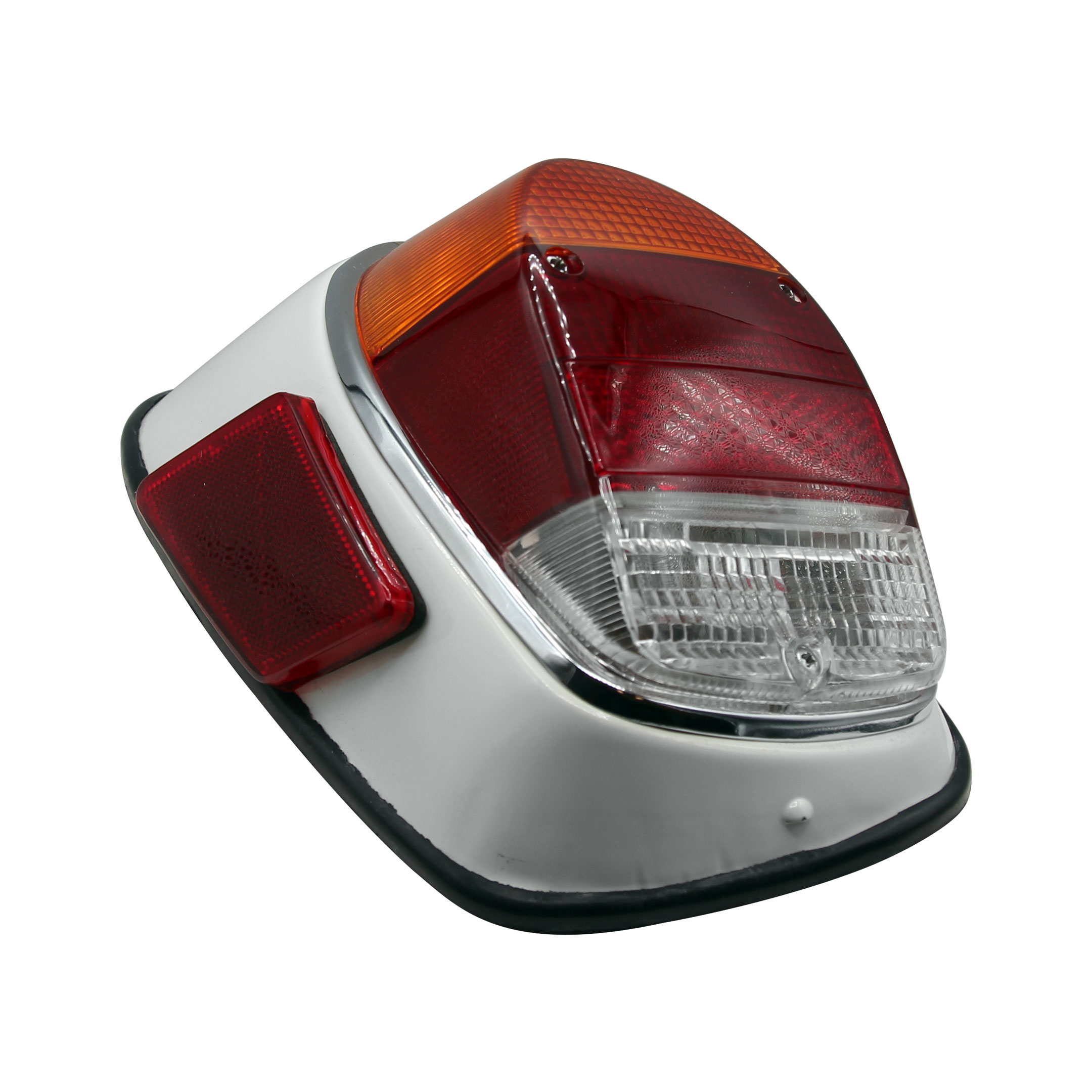 This European-style tail light assembly features an amber and red lens with a white reverse section and is designed as a complete replacement for the left side. The assembly includes the tail light lens, chrome tail light bezel with seal, bulb holder, metal fender housing, and mounting screws, making it a convenient all-in-one solution for replacing a damaged or missing tail light.