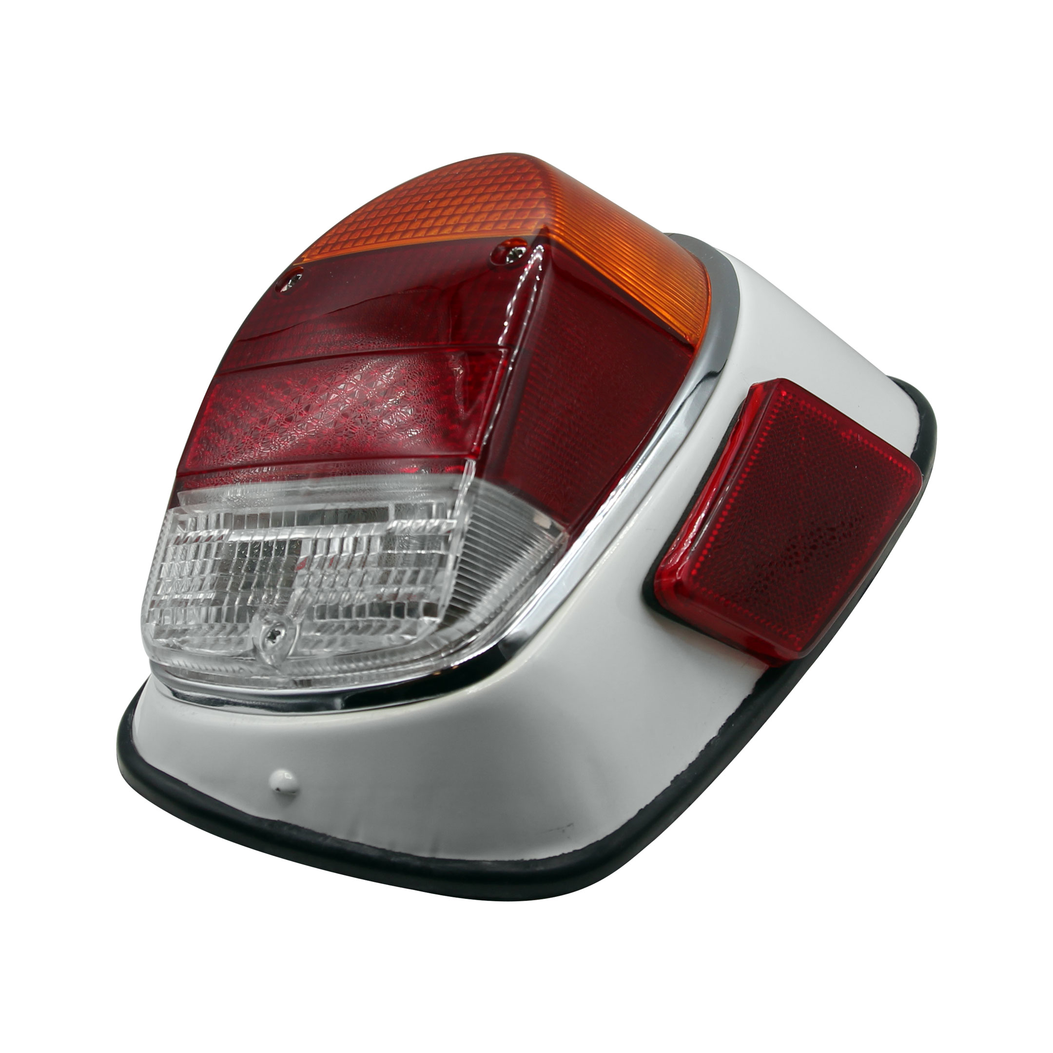 This European-style tail light assembly features an amber and red lens with a white reverse section and is designed as a complete replacement for the right side. The assembly includes the tail light lens, chrome tail light bezel with seal, bulb holder, metal fender housing, and mounting screws, making it a convenient all-in-one solution for replacing a damaged or missing tail light.