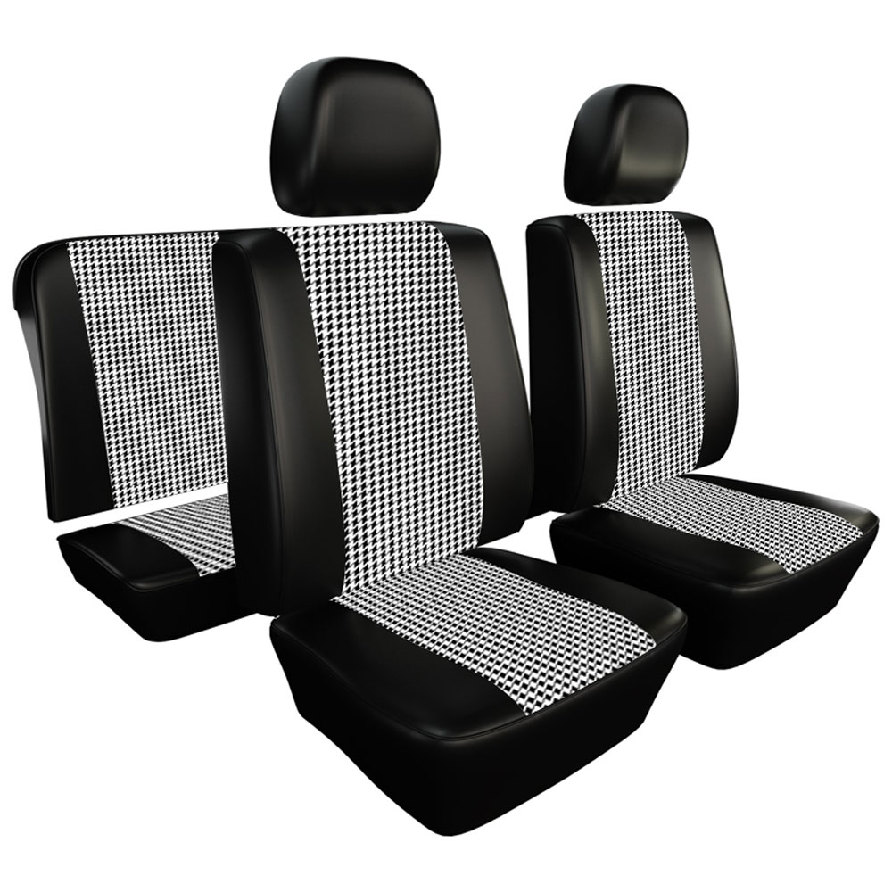Our 1977-1978 VW Beetle Sedan full set seat upholstery kit includes front and rear seat upholstery in 2-tone houndstooth with 12 Inch Insert. The 12 Inch Insert is a 12 inch wide vertical stripe on the seat and backrest surfaces. Choose a houndstooth fabric pattern for the 12 Inch Insert and a smooth vinyl color for the outer areas. Includes vinyl piping and original sewn pattern. Please Note: houndstooth cloth products are not heat seamed. Original patterns are sewn in.