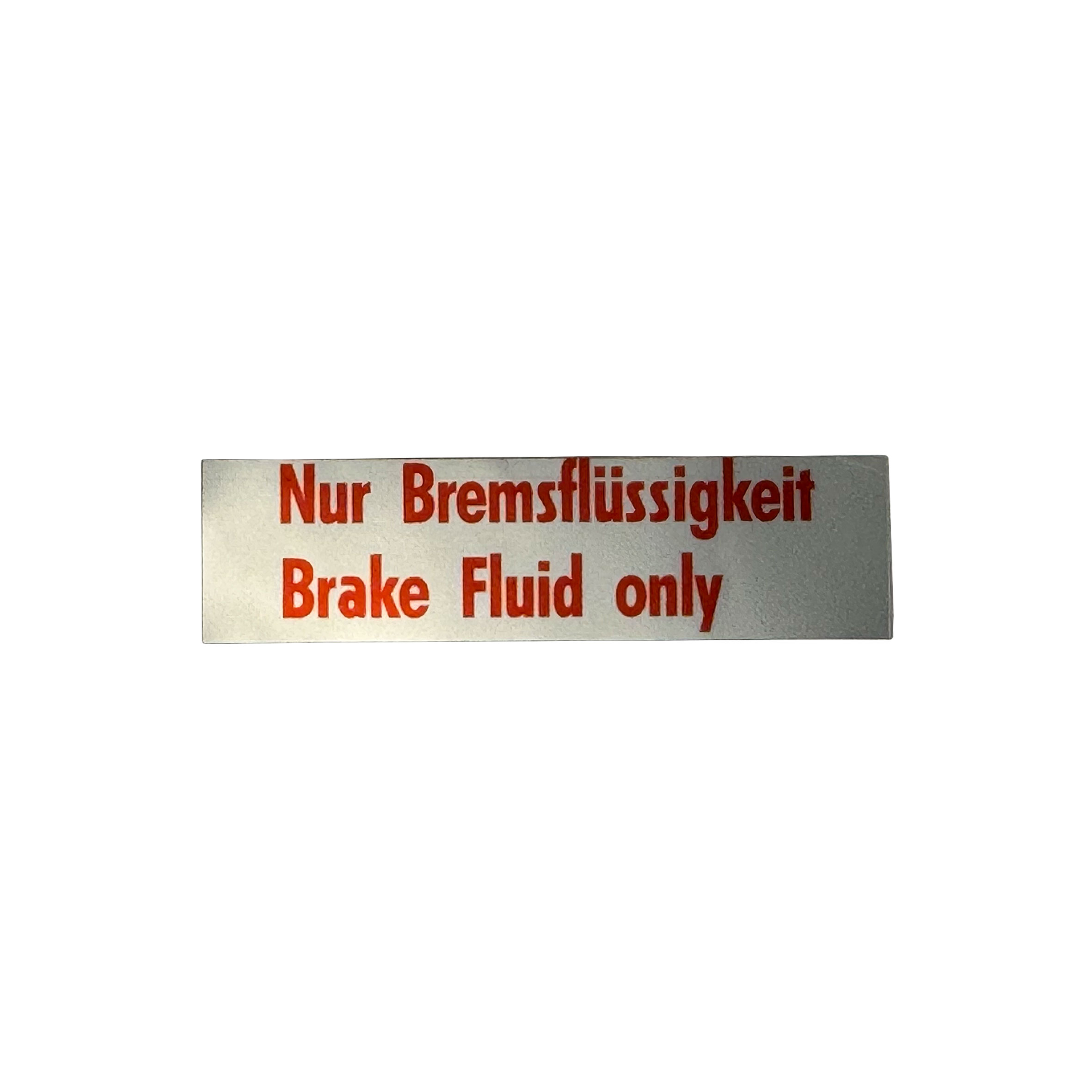 In case someone is wondering what type of fluid goes in the brake fluid reservoir, this silver label with a red warning in German and English should do the trick.