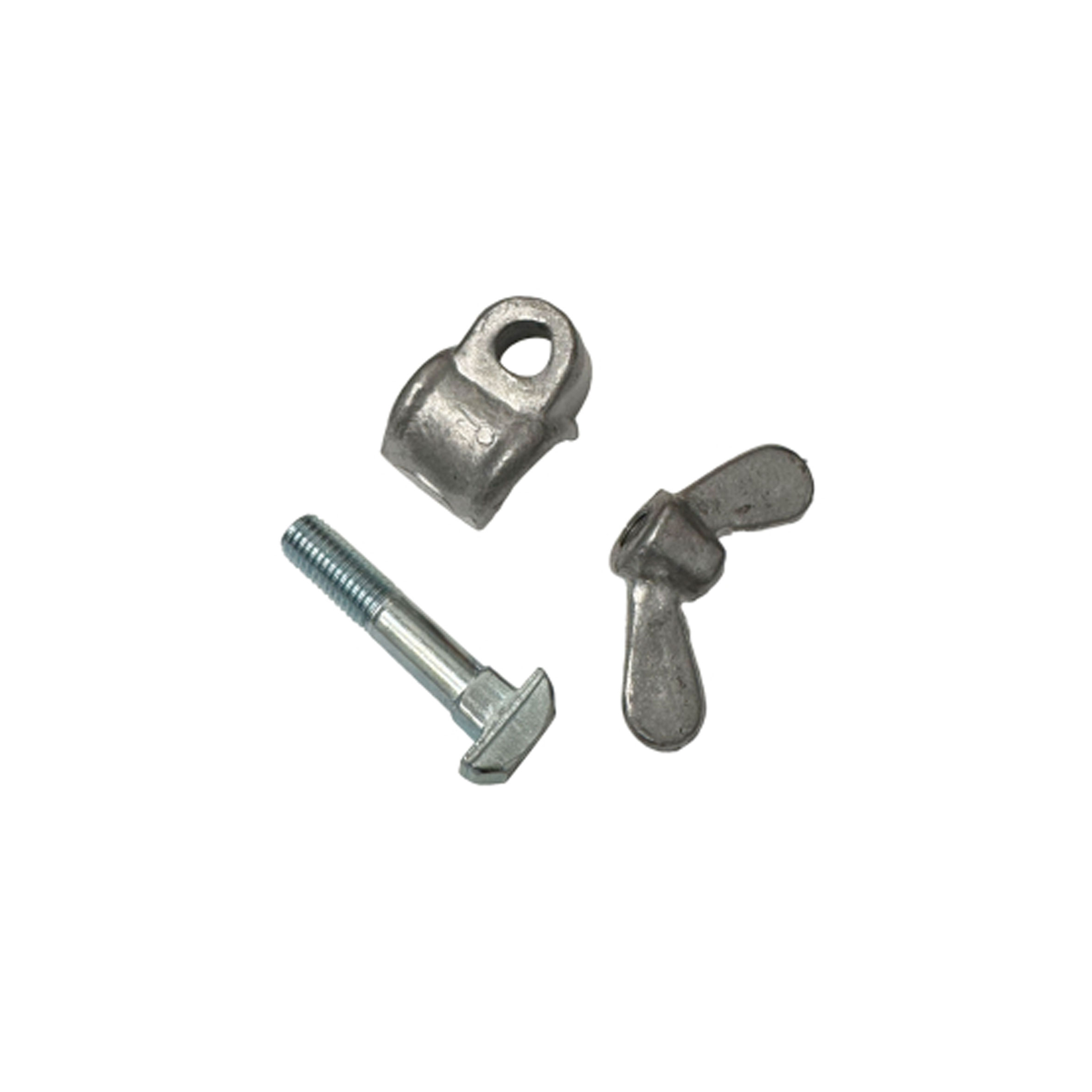 This rear seat mount kit for the VW Type 2 Bus includes a floor brace, seat clamp, T-bolt, and wingnut. The hardware features 10x1.5mm threads and securely fastens the seat to the vehicle floor. The rear seat uses two kits, while the middle seat requires four along with a clamp plate.