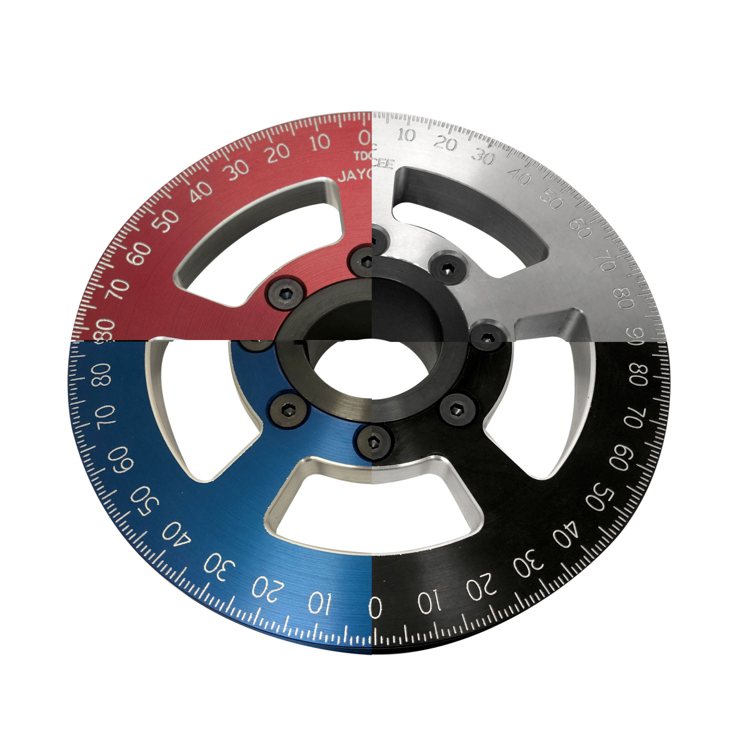 JayCee's 2 piece, 6" Billet Aluminum Crankshaft Pulley is CNC milled, anodized (black, blue, red or clear) and then milled again with 360 degree timing marks. The pulley is bolted to a steel hub (perfect for use with aluminum engine cases) which is reversed grooved like stock to help prevent blow by. The aluminum pulley is bolted to the steel hub with 8 countersunk allen bolts and the pulley fits 1961 through 1977 Standard Beetles, 1971 through 1979 Super Beetles, 1961 through 1974 Karmann Ghias, 1961 through 1971 Type 2 Bus models and 1973 through 1974 Things with 1200cc 40 horse to 1600cc Type 1 based upright engines.
