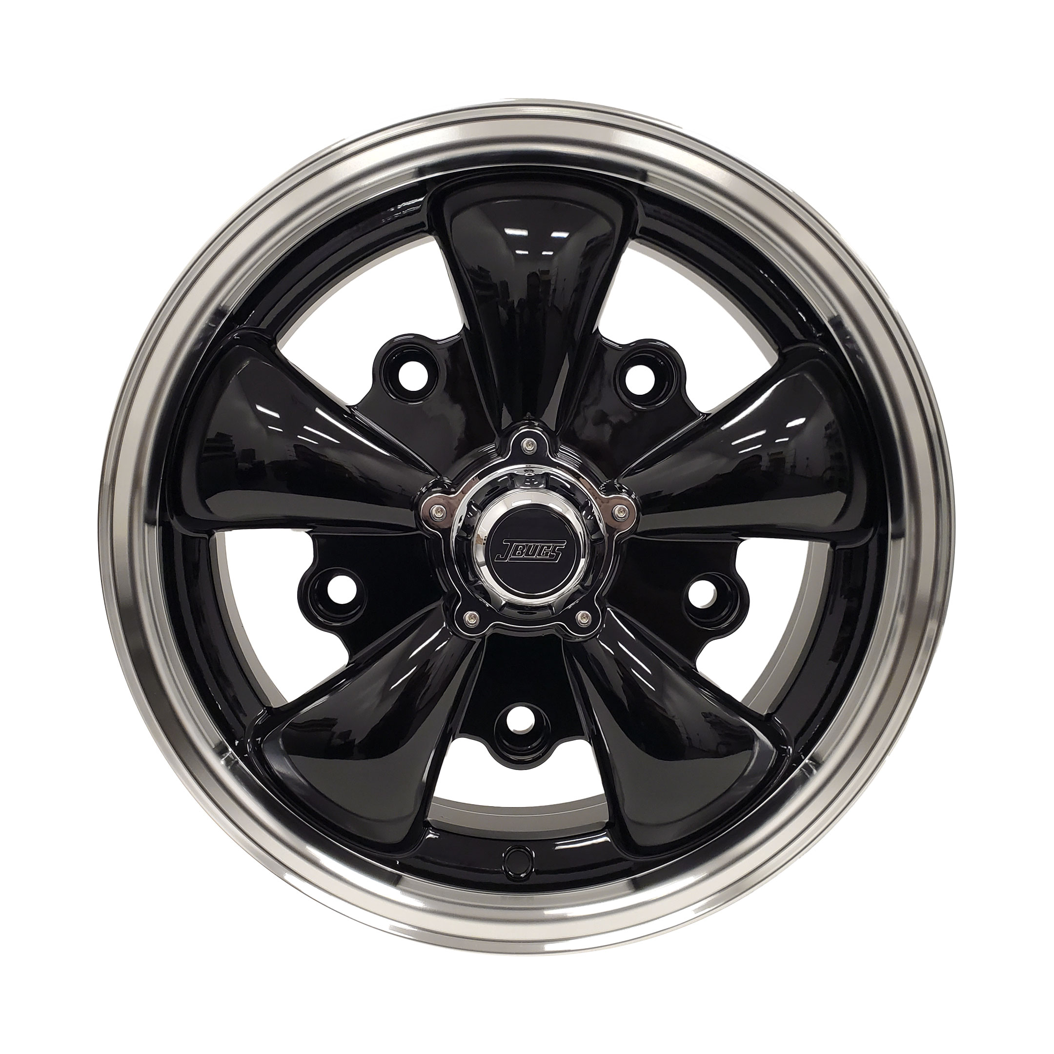 Our JBugs 5 spoke VW wheel delivers a timeless, bold appearance with a gloss black face and polished lip. Built to exact specifications and closely monitored at every production stage, these wheels combine reliable performance with head-turning style. The 5x205 bolt pattern ensures a proper fit for classic Volkswagen models, while the included JBugs-branded chrome center cap and chrome-capped valve stems complete the look. Designed for 60-degree conical seat hardware, these aluminum wheels install securely and provide long-lasting durability.