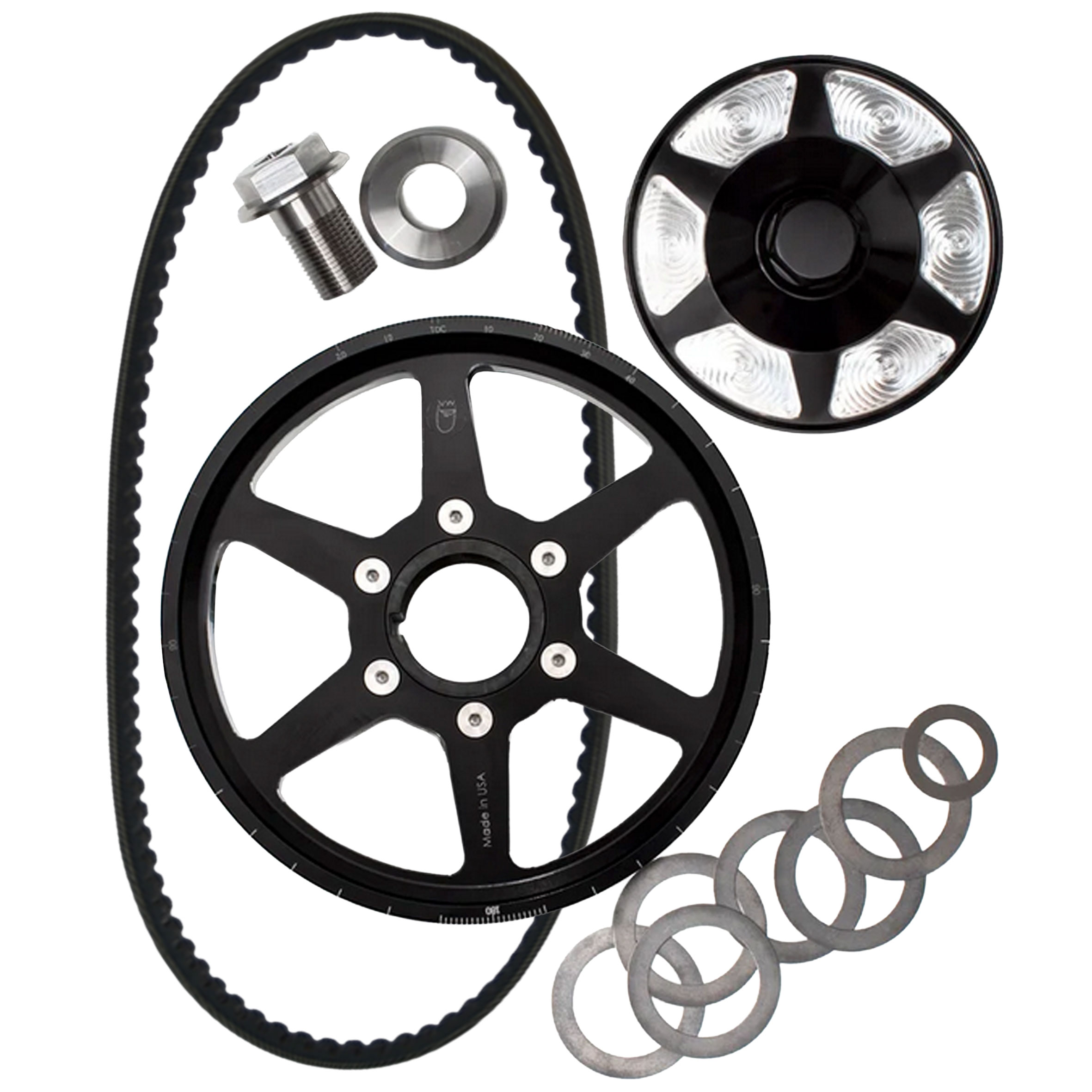 King Performance proudly makes their pulleys and components in the USA with US sourced materials. Secure the crank pulley bolt with LAT Red High Strength Thread Lock and tighten it to 80 lb-ft. King includes a belt that should work for most applications, if the belt is too large or too small another belt will need to be sourced.