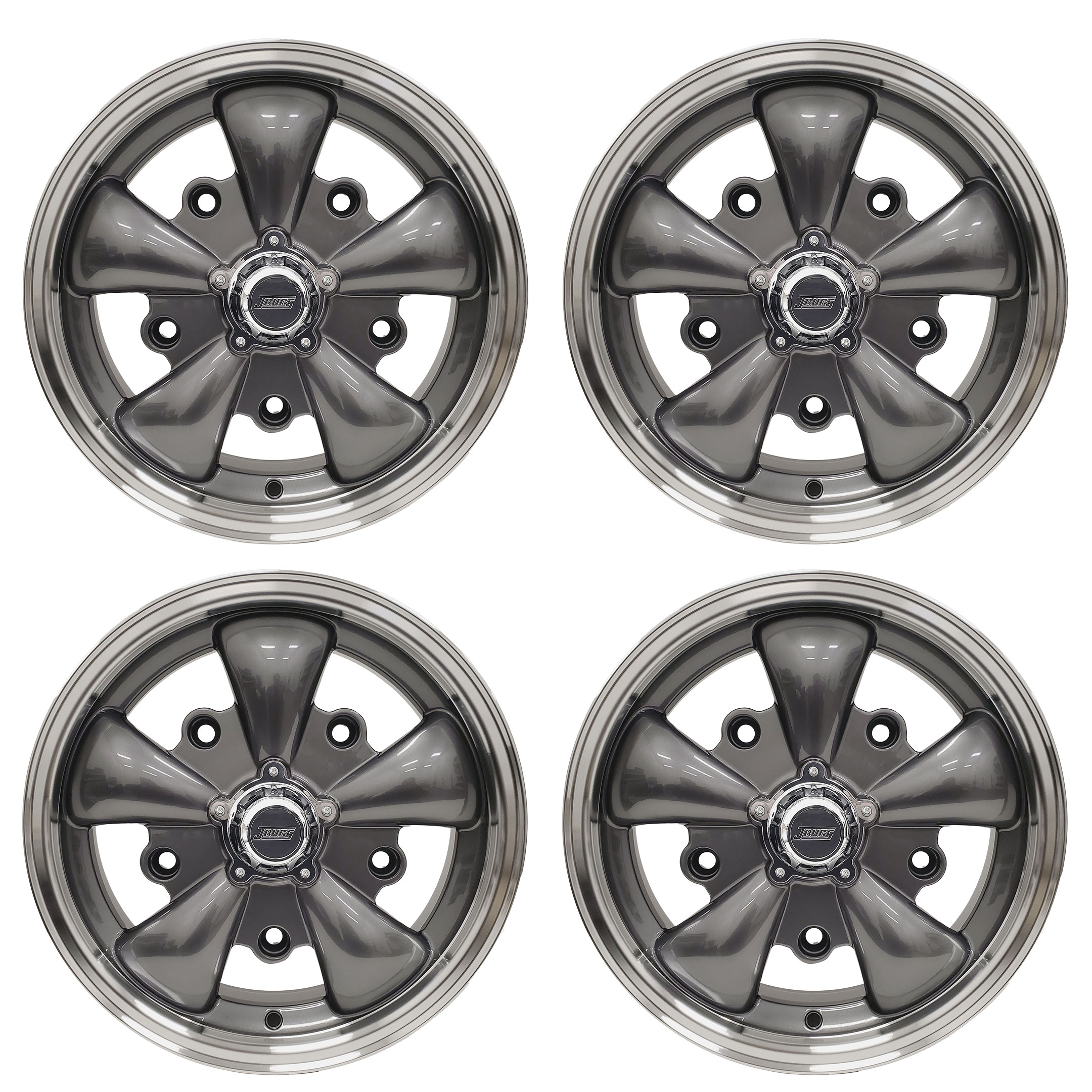 The JBugs 5 spoke VW wheels in a gunmetal finish with a polished lip combine a modern, aggressive look with proven fit and durability for your Volkswagen. Constructed from strong aluminum alloy and carefully inspected throughout production, these wheels are built for dependable, long-lasting service. They come complete with JBugs-branded gunmetal center caps and machined valve stem caps, and are compatible with 60-degree conical seat hardware for a secure and proper fit.