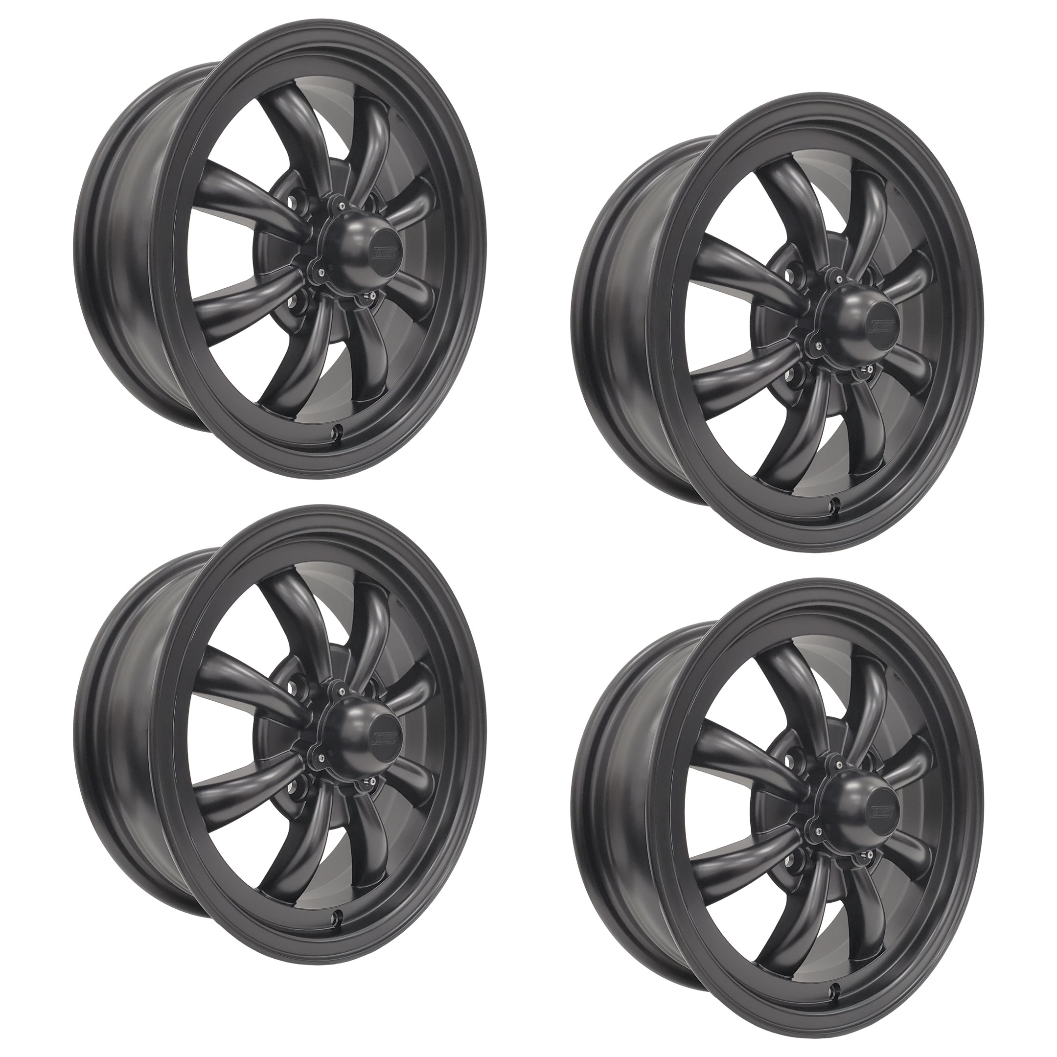 Our JBugs 8 spoke VW wheels feature a sleek, all black satin finish that offers a subtle, refined look without sacrificing performance or strength. Built to exact specifications and overseen for consistent quality, these aluminum wheels deliver dependable durability and a confident fit. Each wheel includes a JBugs-branded center cap and chrome-capped valve stem for a finished, ready-to-install solution. The 4x130 bolt pattern is designed to work with 60-degree conical seat hardware for secure mounting.