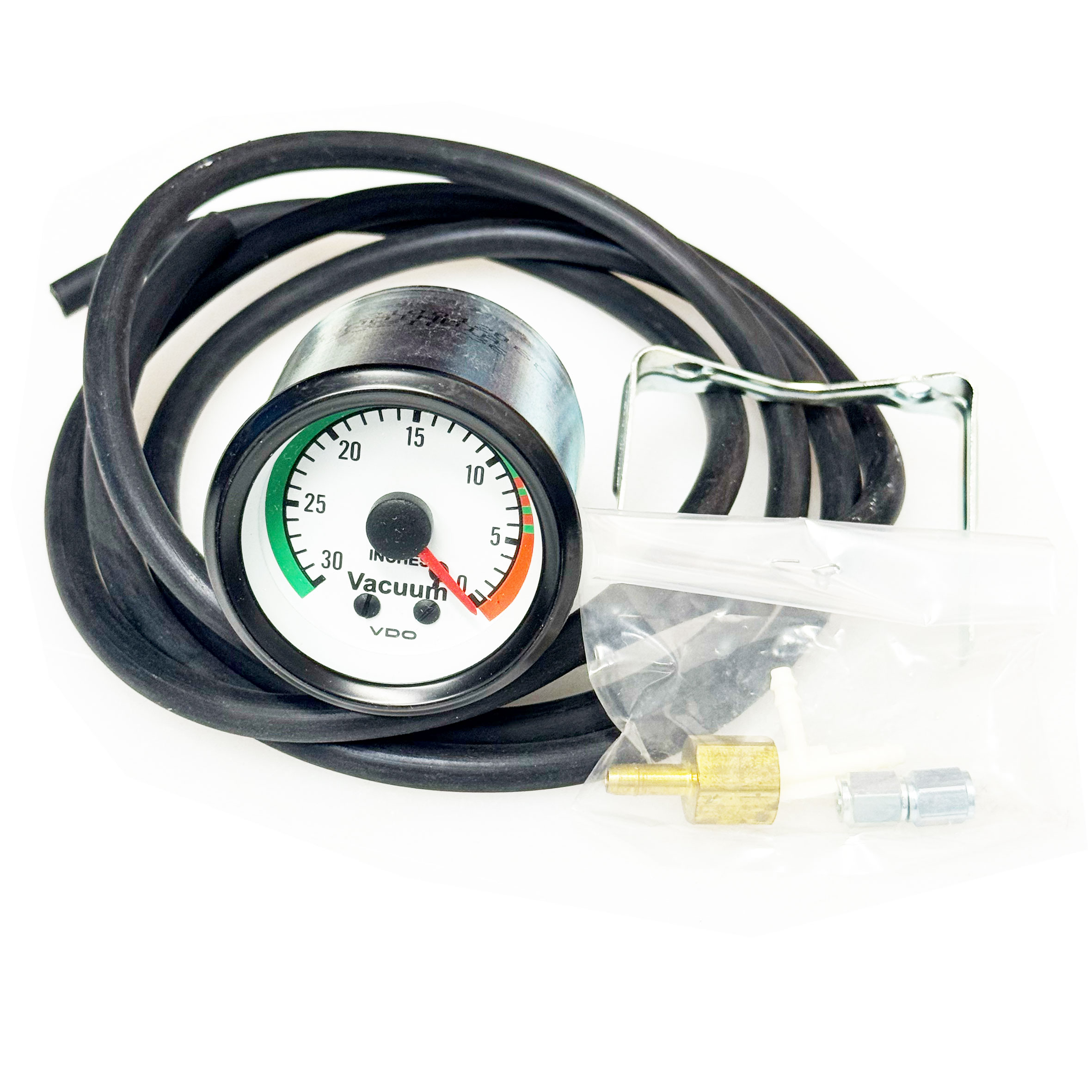 This VDO Cockpit White Series Mechanical Boost Gauge features a sleek white face with an orange arm. The 2 1/16" gauge is perfect for you guys chasing MPG, since it's best to just drive at the highest vacuum possible to squeeze every last mpg out of that expensive fuel! That gauge face sweeps from 0 to 30 inches of vacuum on a red to geen dial. This is the most useful item to maximizing MPG in your cars. The kit includes 6 feet of tubing, an adapter fitting and a t-fitting along with mounting hardware for the gauge itself.