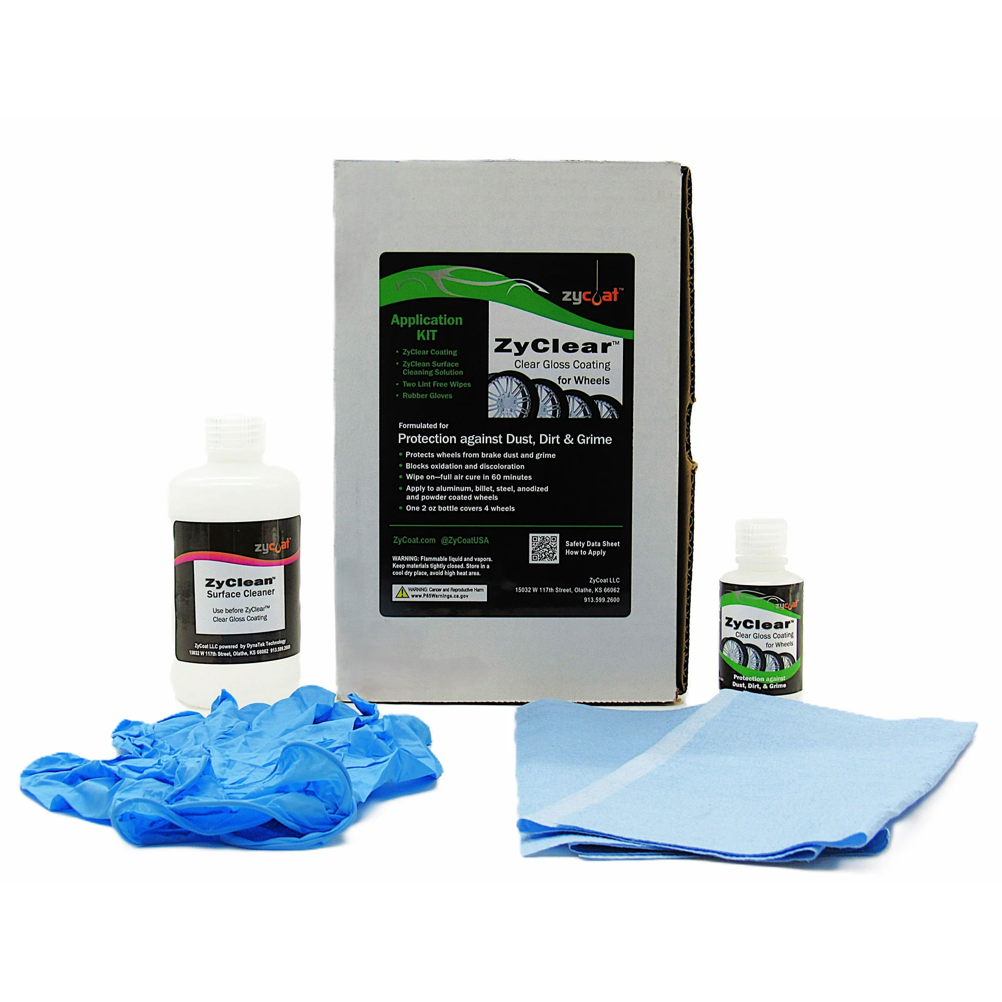 The ZyClear wheel clear coat package includes the ZyClear liquod, gloves, and wipes to protect your wheels. This protective coating prevents dirt and grime from sticking to your wheels and also makes washing much easier as the brake dust and other road grime quickly and easily washes off.