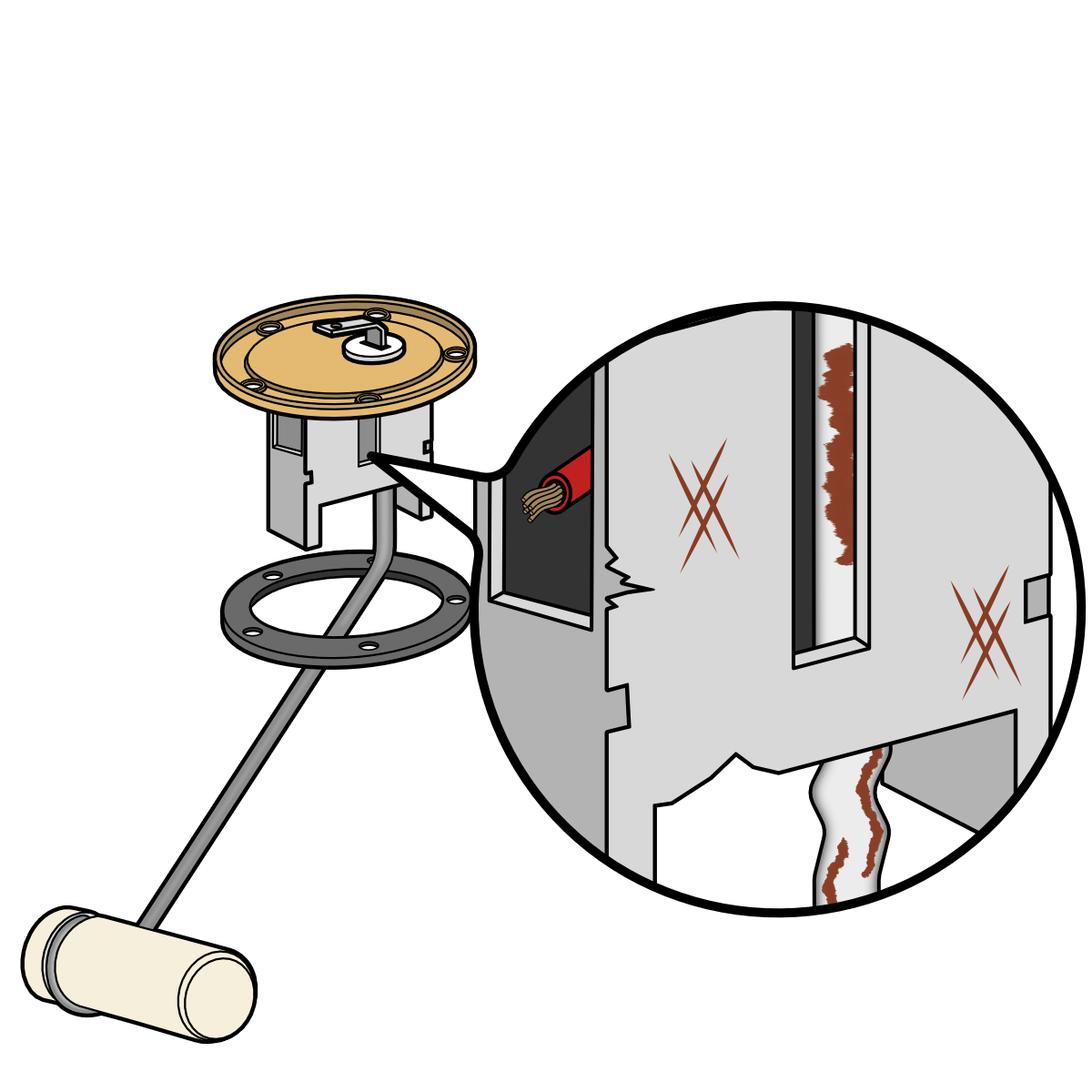 Plastic housing (aftermarket sensors) may become brittle or crack, restricting float movement.