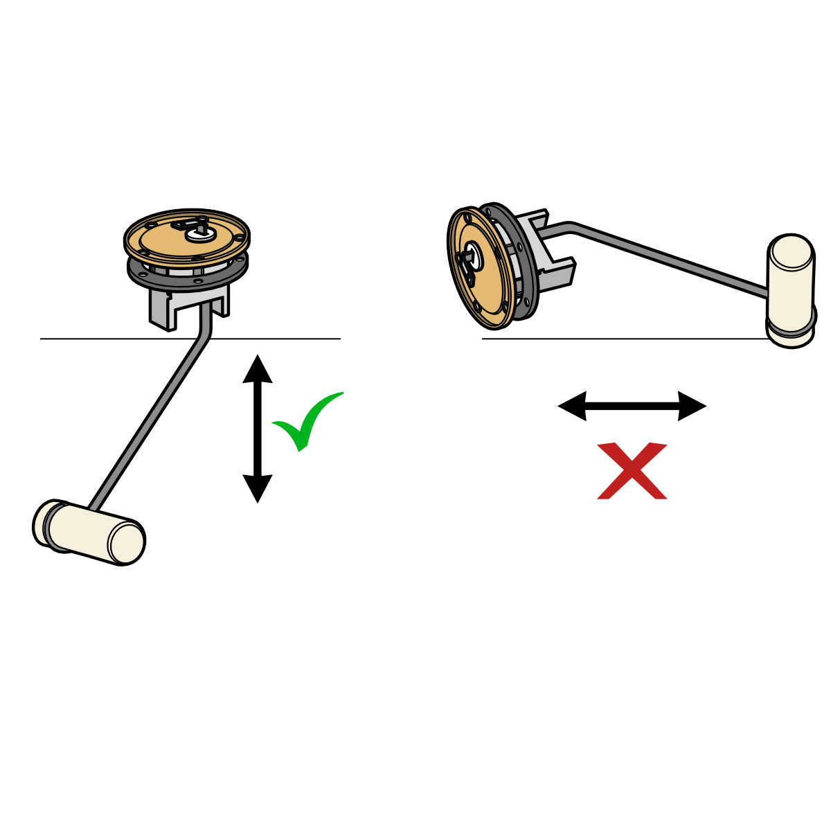 Test the unit in the same upright position it will be mounted in the fuel tank. For Air cooled VW's, the sending unit is mounted upright. This orientation is necessary to ensure the float and metal arm move freely in the intended manner without obstruction. Testing the unit sideways may cause additional or reduced pressure between the arm and resistance sensor, which will result in false readings.